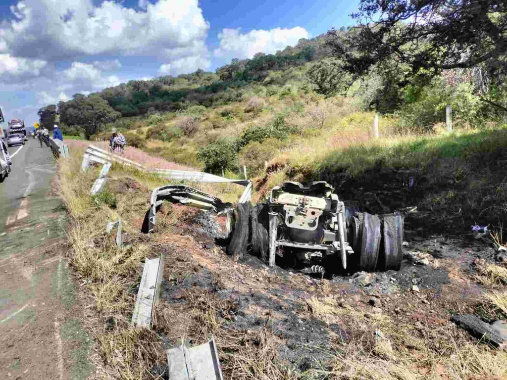 Se apreció los dos remolques de la unidad quedaron atravesados, en tanto que la cabina cayó a un desnivel donde se incendió por completo y el conductor alcanzó a salira tiempo. Posteriormente arribaron socorristas y bomberos municipales, éstos últimos sofocaron la lumbre.