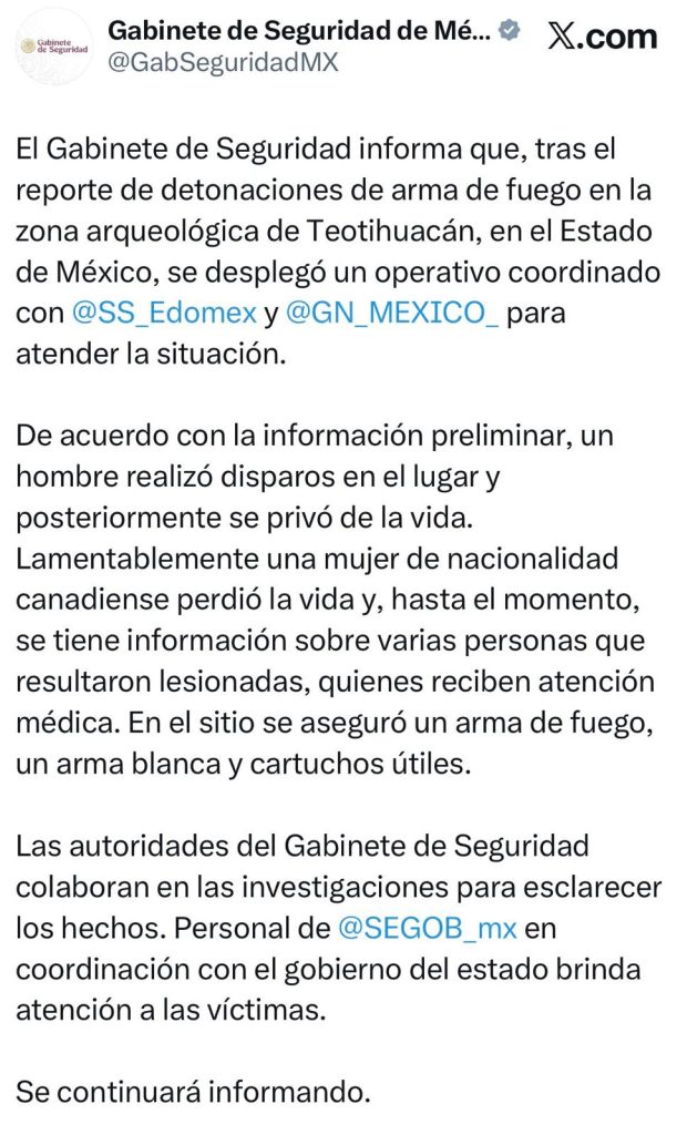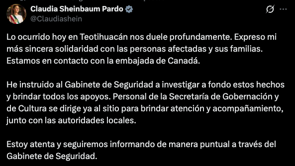 Lo ocurrido hoy en Teotihuacán nos duele profundamente. Expreso mi más sincera solidaridad con las personas afectadas y sus familias. Estamos en contacto con la embajada de Canadá. He instruido al Gabinete de Seguridad a investigar a fondo estos hechos y brindar todos los apoyos. Personal de la Secretaría de Gobernación y de Cultura se dirige ya al sitio para brindar atención y acompañamiento, junto con las autoridades locales. Estoy atenta y seguiremos informando de manera puntual a través del Gabinete de Seguridad.