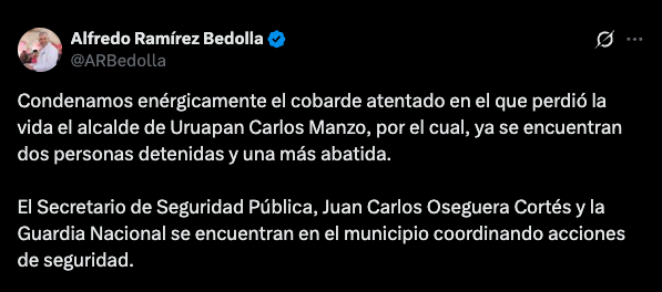 El hecho ha conmocionado a la sociedad michoacana y a todo el país, dado el estilo de enfrentar a la delincuencia por parte de Carlos Manzo, con mano dura y aplicando la Ley,