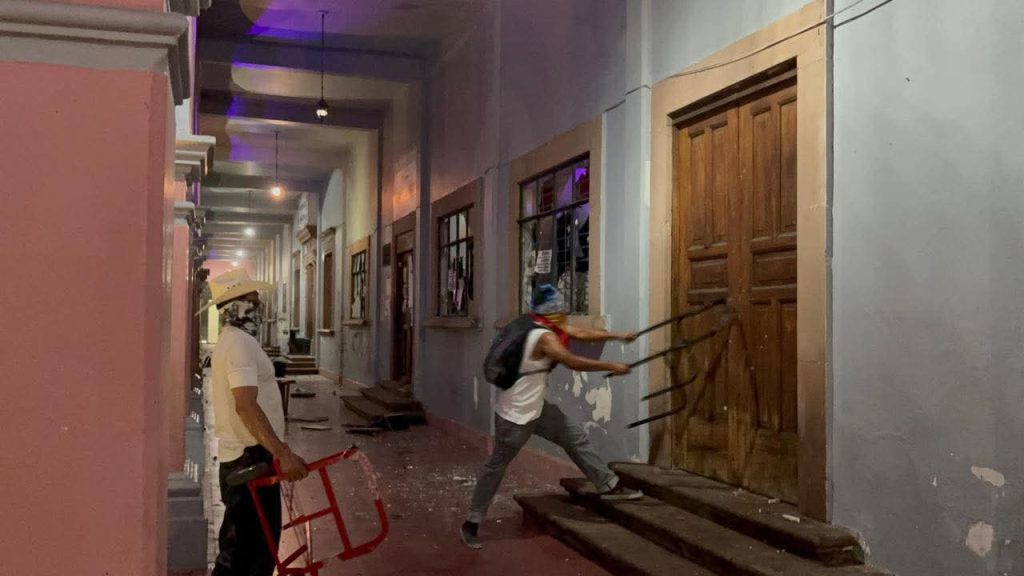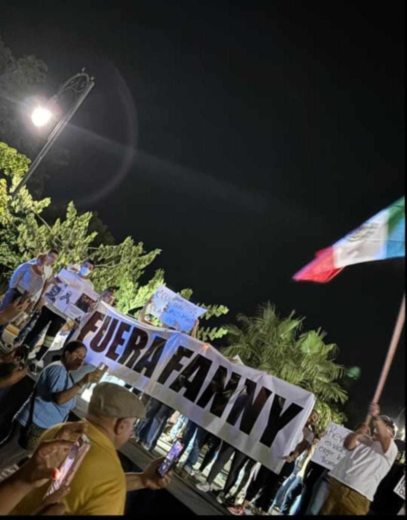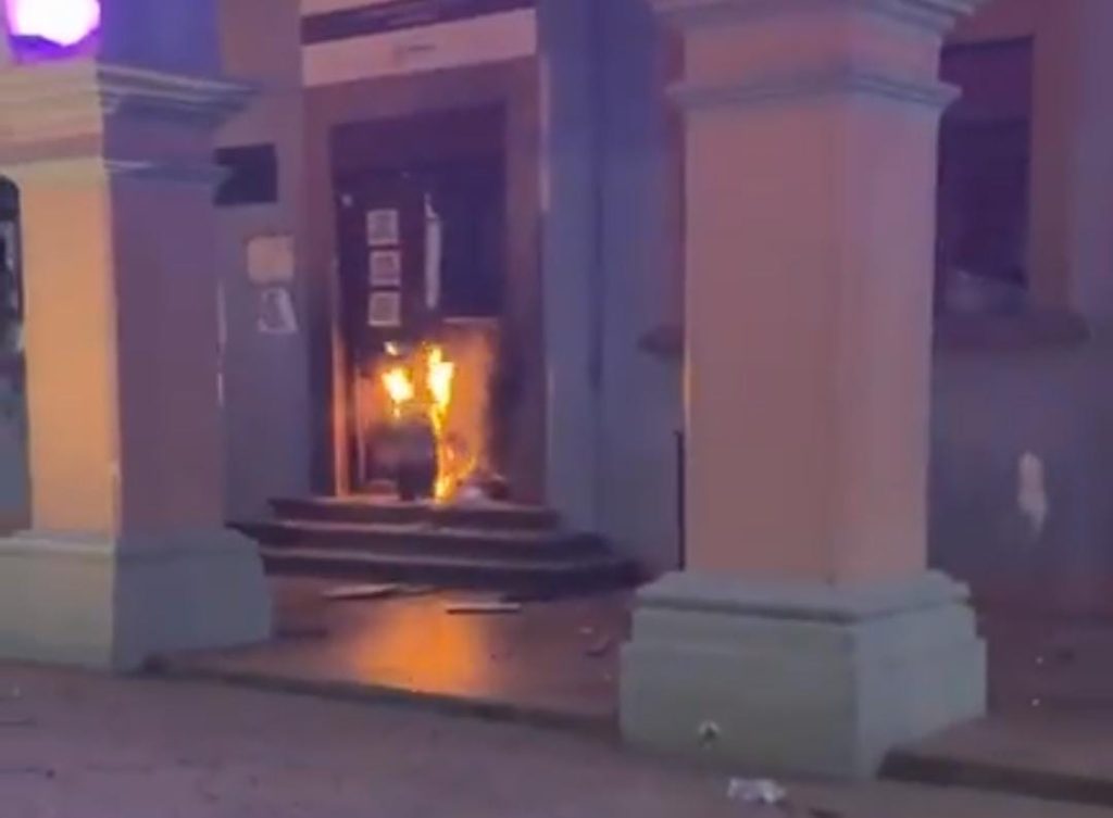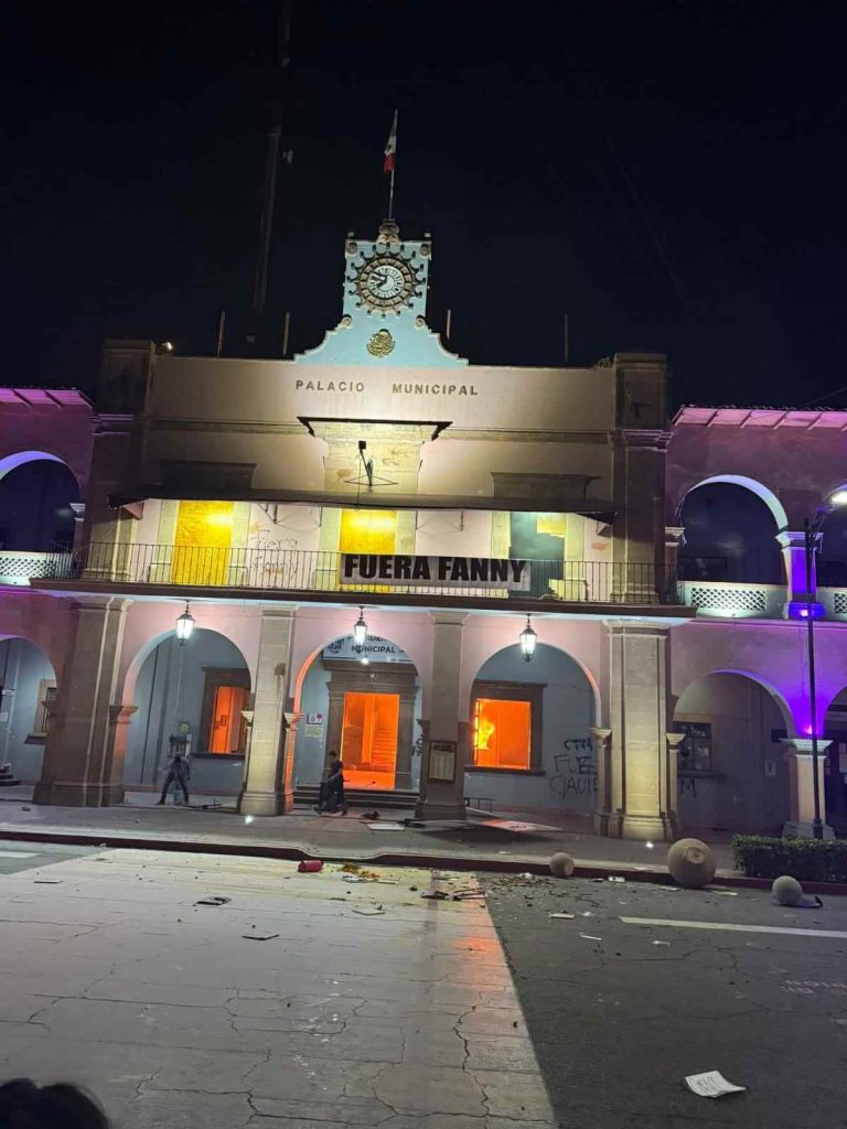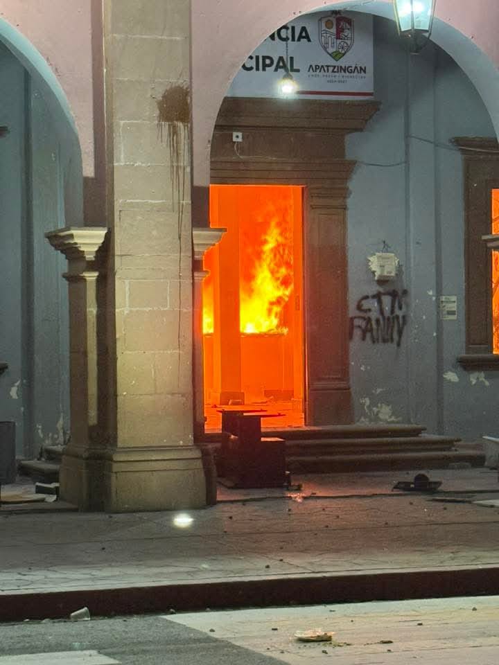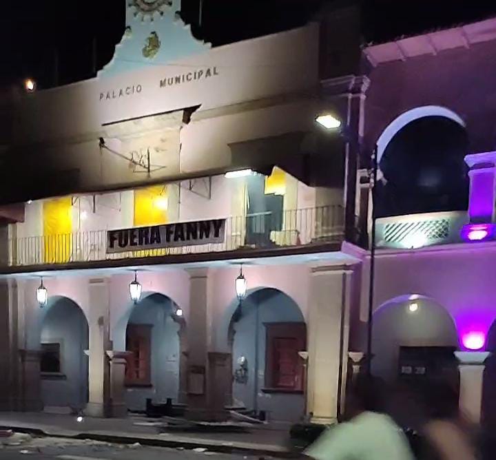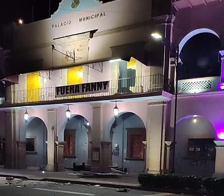 Acto seguido por la fuerza varios encapuchados ingresaron a las instalaciones municipales a destrozar mobiliario y prendieron fuego en algunas áreas al interior, subieron al segundo piso donde continuaron los destrozos y colocaron una manta en el barandal con la leyenda “Fuera Fanny”. El palacio municipal fue destrozado.