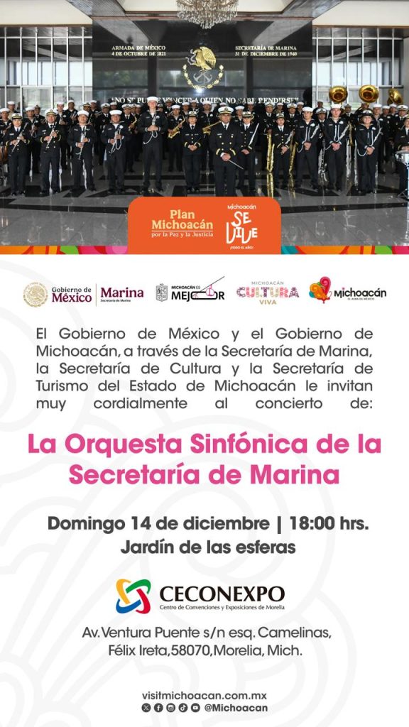 Morelia, Michoacán, 13 de diciembre de 2025.- Vive una experiencia única y disfruta del concierto que la Orquesta Sinfónica de la Secretaría de Marina ofrecerá mañana domingo 14 de diciembre en el Centro de Convenciones y Exposiciones de Morelia (Ceconexpo).
