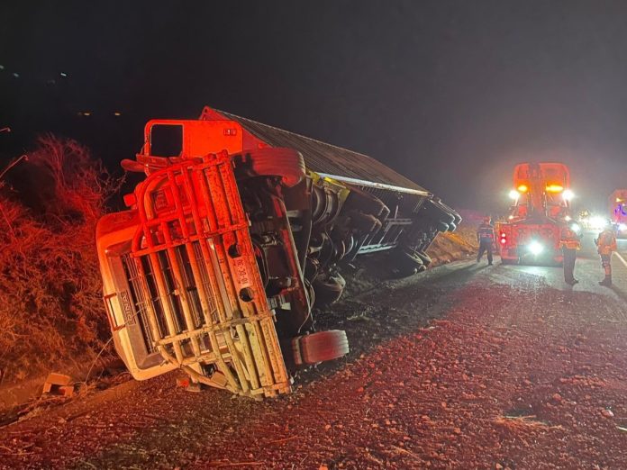 Gabriel Zamora, Mich.- 4 de febrero de 2025.- Un accidente automovilístico tipo volcadura se registró sobre la Autopista Siglo XXI, en el tramo Gabriel Zamora-Cuatro Caminos, lo que generó la movilización inmediata de los cuerpos de emergencia durante la noche.