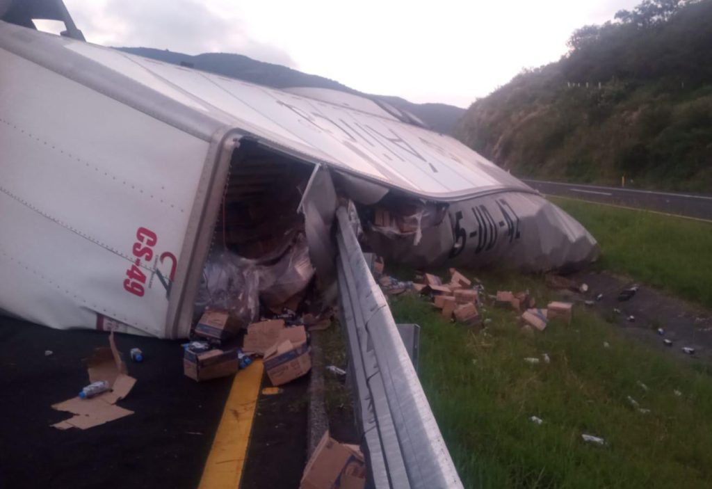 El incidente únicamente dejó daños materiales. El percance se registró este domingo en el kilómetro 258, a la altura del municipio de Chucándiro. Según las fuentes, los contenedores transportaban sueros de electrolitos.