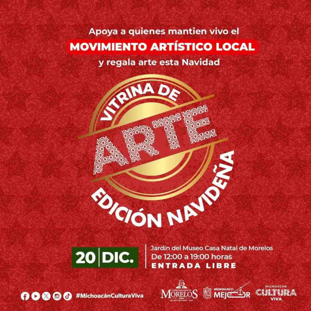 Morelia, Michoacán, 8 de diciembre de 2025.- La Secretaría de Cultura de Michoacán invita a disfrutar y apoyar el talento local en la Vitrina de Arte edición navideña, que se realizará el próximo 20 de diciembre, de 12:00 a 19:00 horas, en el jardín del Museo Casa Natal de Morelos con entrada libre.