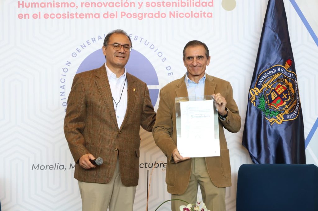 Morelia, Michoacán, a 10 de octubre de 2025.- El doctor Omar Masera Cerutti, Premio Nóbel de la Paz 2007 y actual investigador del Instituto de Investigaciones en Ecosistemas y Sustentabilidad de la Universidad Autónoma de México (UNAM) visitó la Universidad Michoacana de San Nicolás de Hidalgo (UMSNH) para compartir su invaluable experiencia con la comunidad estudiantil y docente, quien fue recibido por la rectora Yarabí Ávila González.