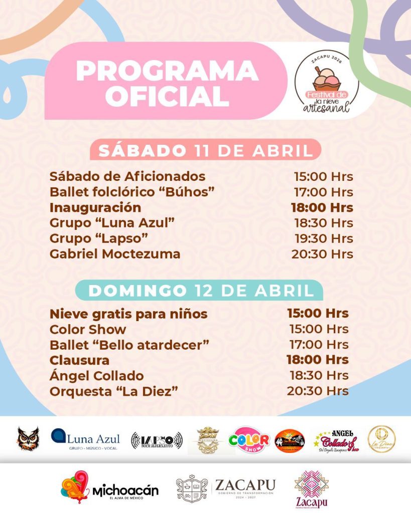 “La tradición de la nieve artesanal de Zacapu comenzó hace casi 80 años, y con este tipo de eventos buscamos que nuestros artesanos tengan una difusión estatal. Tendremos un programa de actividades culturales, musicales y gastronómicas de 12:00 a 22:30 horas”, explicó el funcionario.